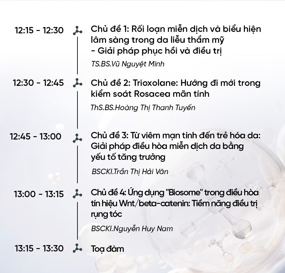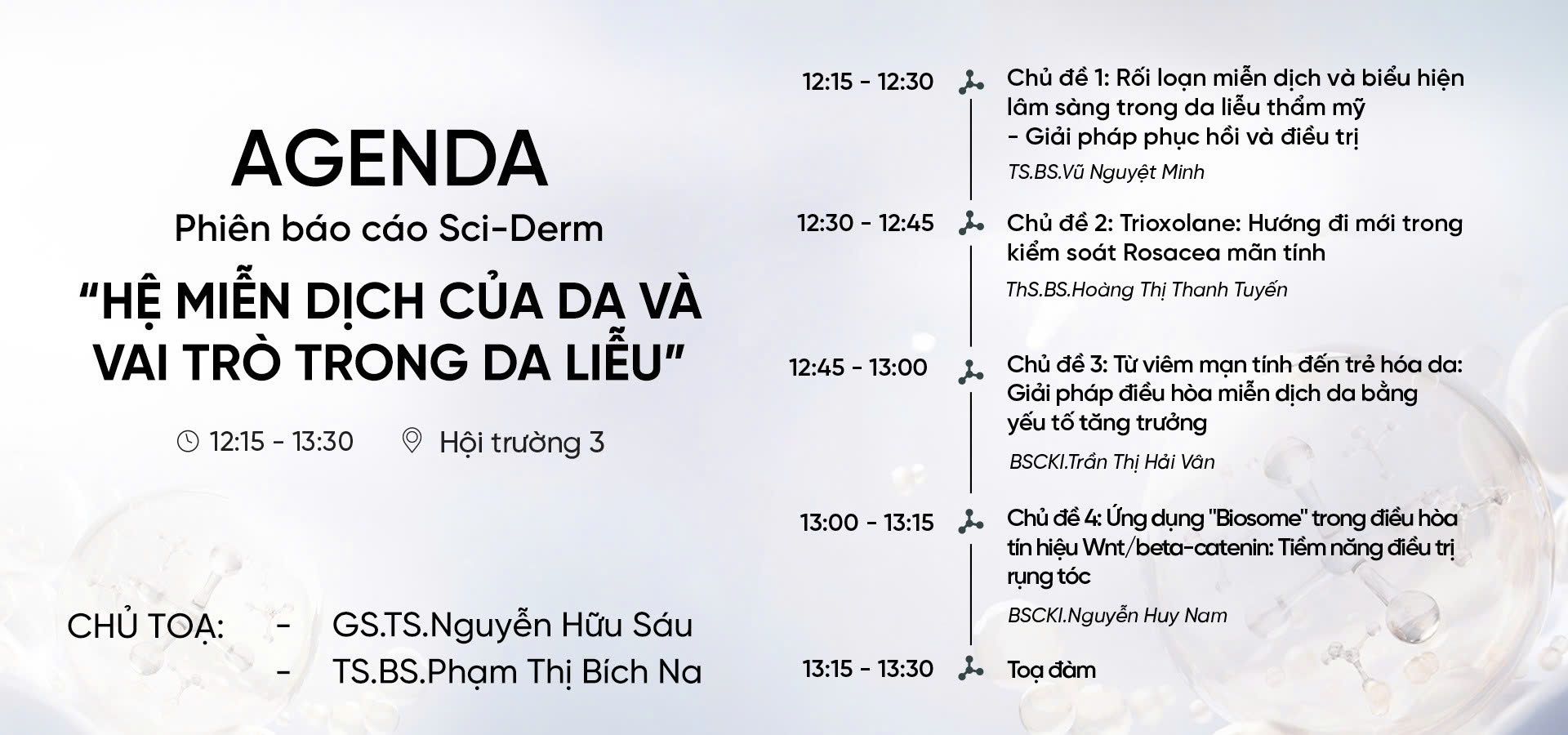 Sci-Derm Professionals tiên phong ứng dụng các tiến bộ khoa học vào chăm sóc và phục hồi làn da, mái tóc với những giải pháp Tái Tạo Sinh Học Đột Phá. Chúng tôi rất mong chờ được gặp Quý Bác sĩ và Đại biểu tại Ballroom Sci-Derm để cùng trao đổi chuyên môn sâu, chia sẻ kinh nghiệm và phối hợp xây dựng phác đồ da liễu ứng dụng phù hợp.